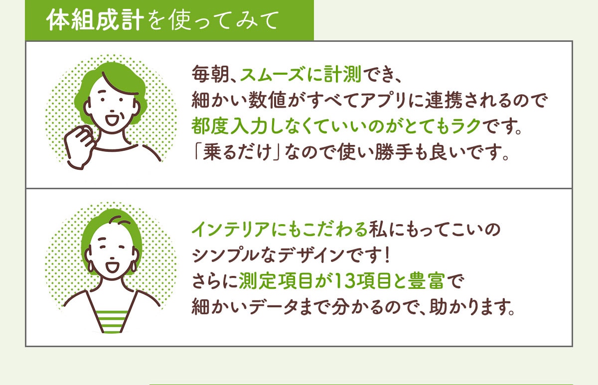 ・体脂肪率をはじめとする体組成データの数値はあくまでも参考値です。毎回同じ条件で計測いただき、その増減や推移を健康管理にお役立てください。